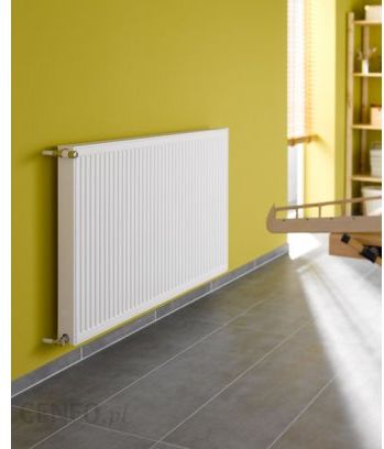 Grzejnik zaworowy KERMI Therm X2 Profil-V z blachy stalowej, z podłączeniem od dołu (prawo lub lewostronnym) produkowany według normy PN EN 442, oznakowany znakiem CE. Szeregowe połączenie płyt grzejnika (najpierw zasilana jest płyta przednia, a następnie tylne płyty) pozwala skrócić o 25 % czas rozgrzewania pomieszczenia oraz zwiększyć do 100% emisję energii przez promieniowanie. Zintegrowana wkładka zaworowa z nastawioną wstępnie wartością kV, fabrycznie wyregulowaną odpowiednio do wydajności cieplnej grzejnika, certyfikowana według normy EN 215.