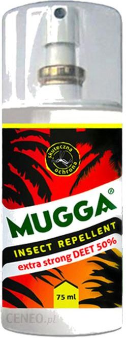 Mugga Spray 50% 75ml Silny preparat chemiczny odstraszający insekty przeznaczony do użycia w ekstremalnych warunkach i rejonach tropikalnych, gdzie występuje wysokie ryzyko wystąpienia malarii, dengi, żółtej febry, boreliozy i innych groźnych chorób przenoszonych przez insekty min. komary, moskity i kleszcze.Jego skuteczność została potwierdzona w laboratorium i w terenie oraz przetestowana na ok. 2500 gatunkach komarów. Najbardziej popularne gatunki to: Aedes sp., Anopheles sp., Culex sp., Mansonia sp., Psorophora sp.