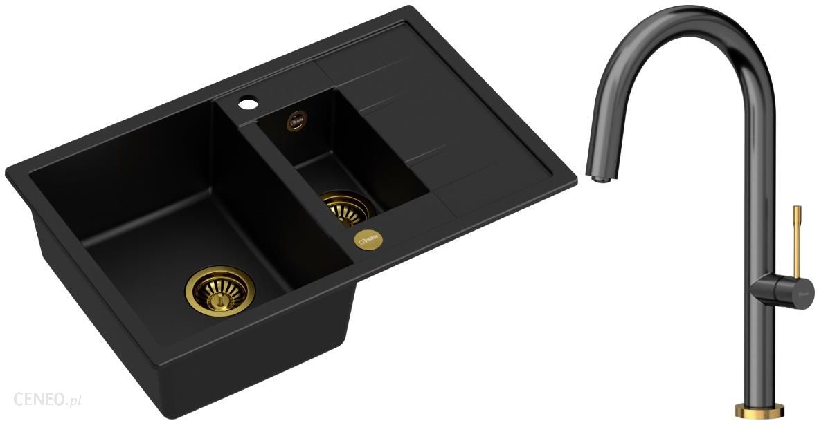 Quadron – zlewozmywak wpuszczany granitowy MORGAN 156 pure carbon / złoto odwracalny z baterią HALEY Tline graphite metal / złoto szczotkowane 40 cm